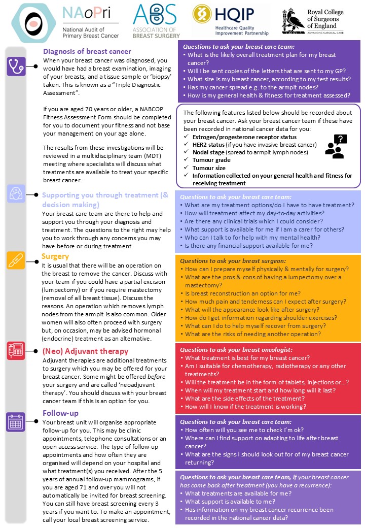 This guide was originally designed during the lifetime of the legacy audit the National Audit of Breast Cancer in Older Patients (NABCOP) to be useful to patients and clinicians alike.
